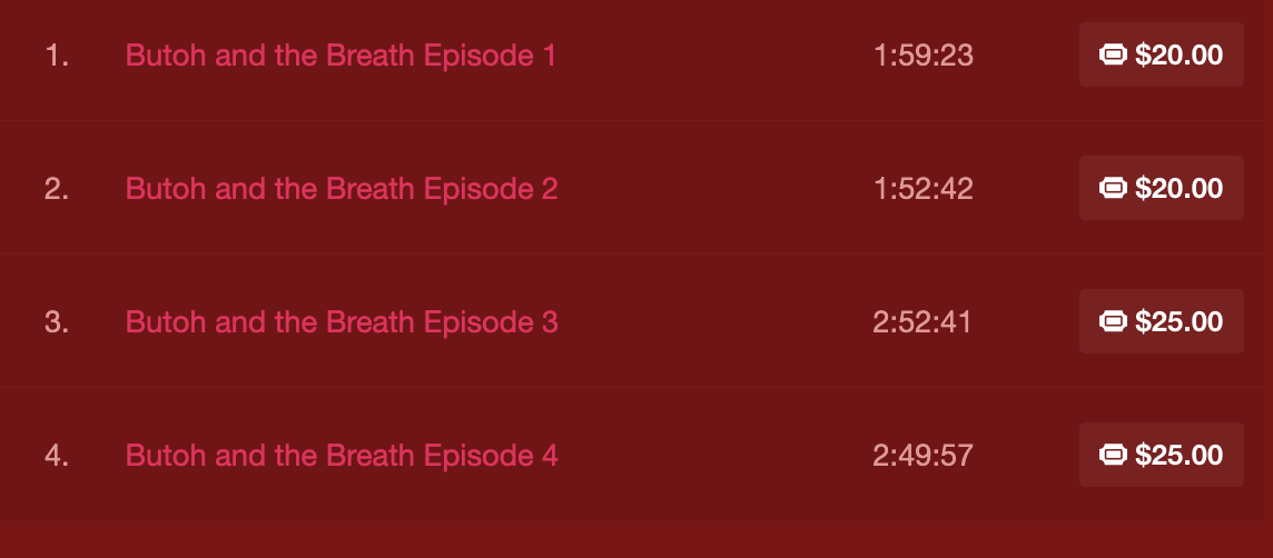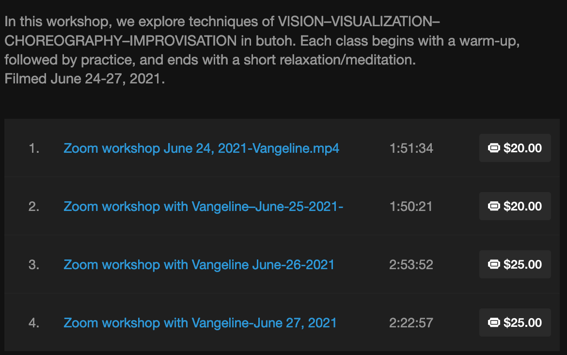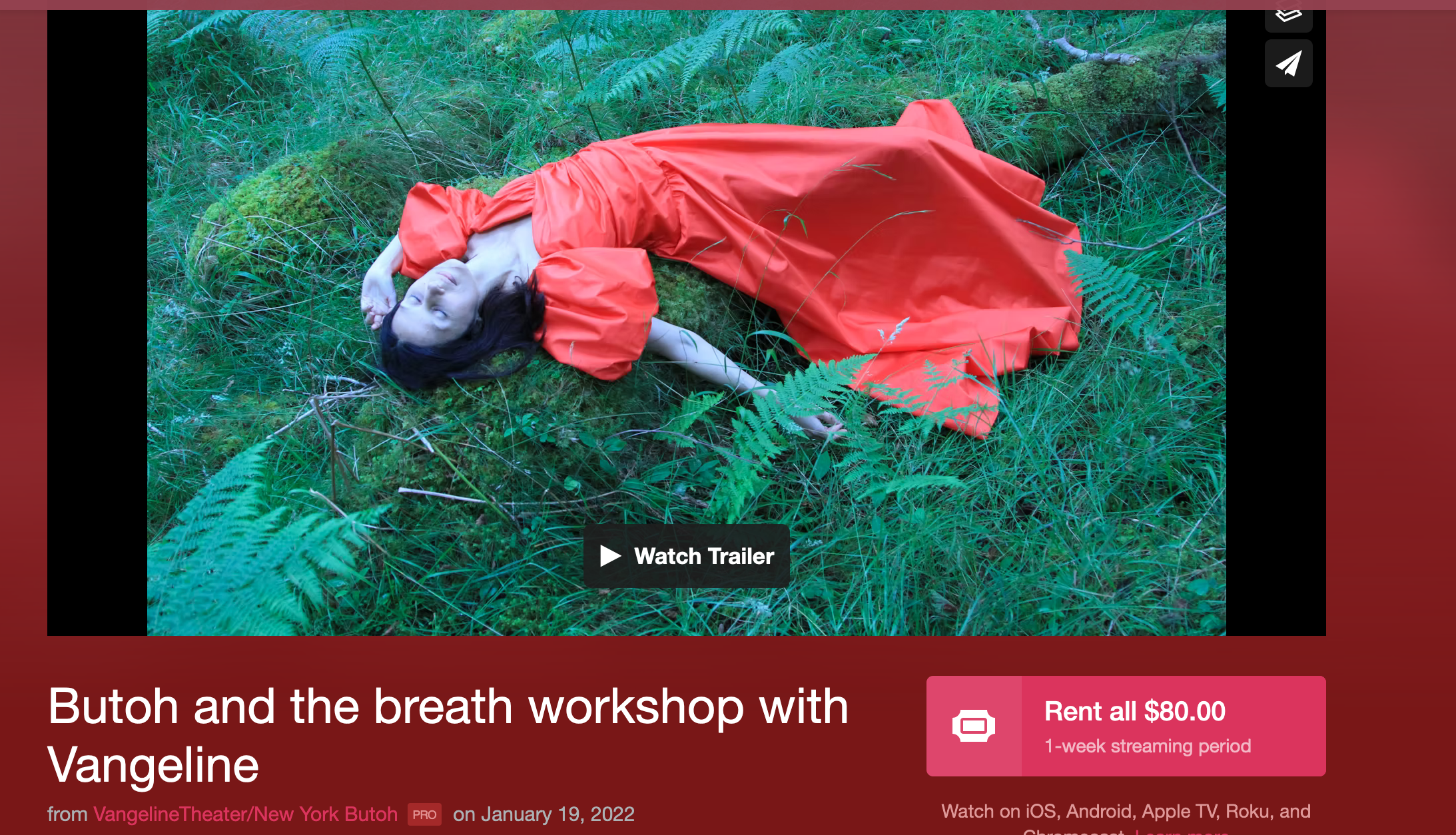 Learn Butoh dance at your own pace; choose from a selection of on-demand classes with Vangeline, or longer butoh workshops, on your own time. Beginners are welcome. All classes are trauma-informed.