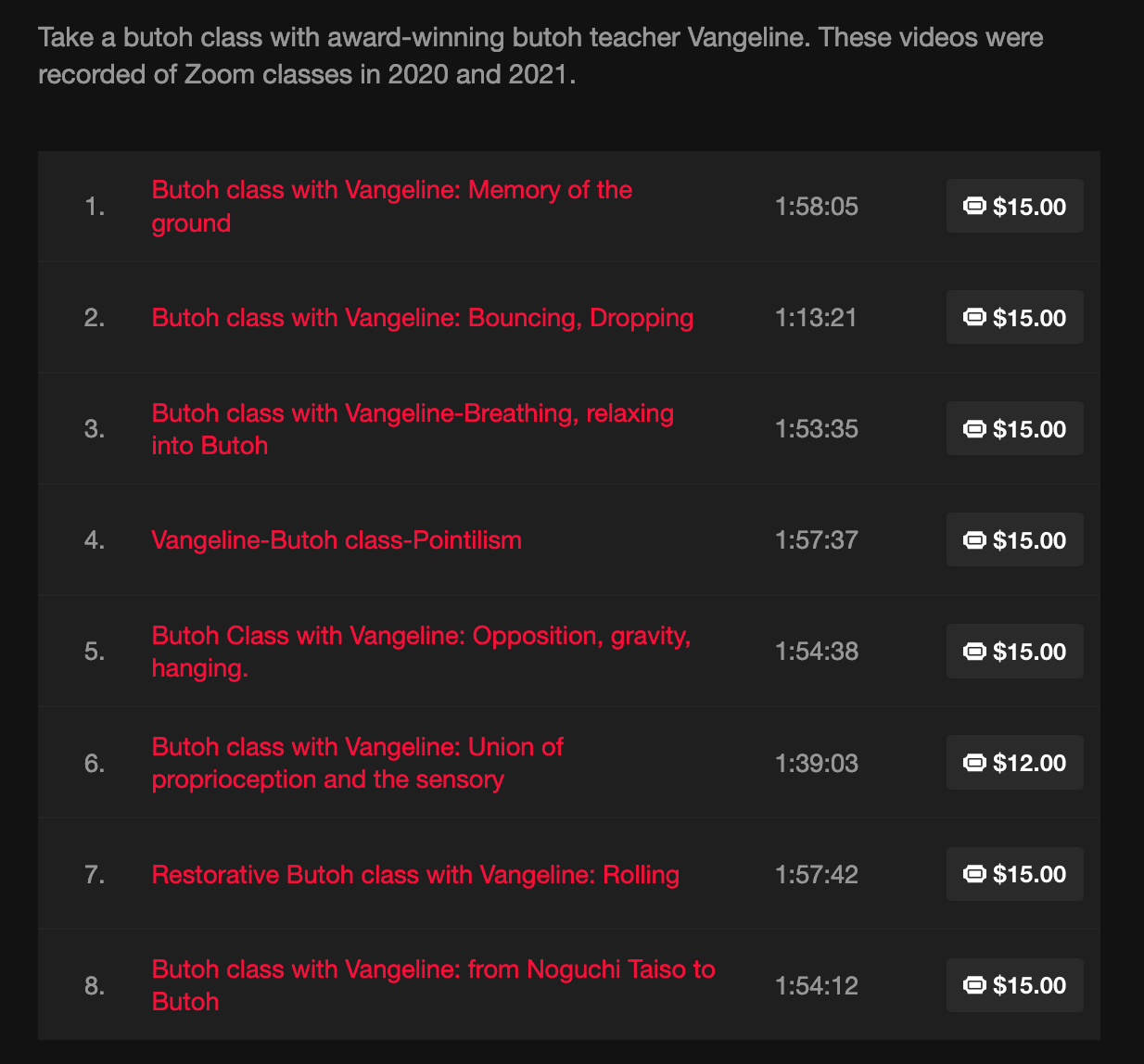 Single classes are 2 hours and $15 each. Led by award-winning butoh dancer and teacher Vangeline. Choose from a wide selection of classes. Availability: Worldwide.